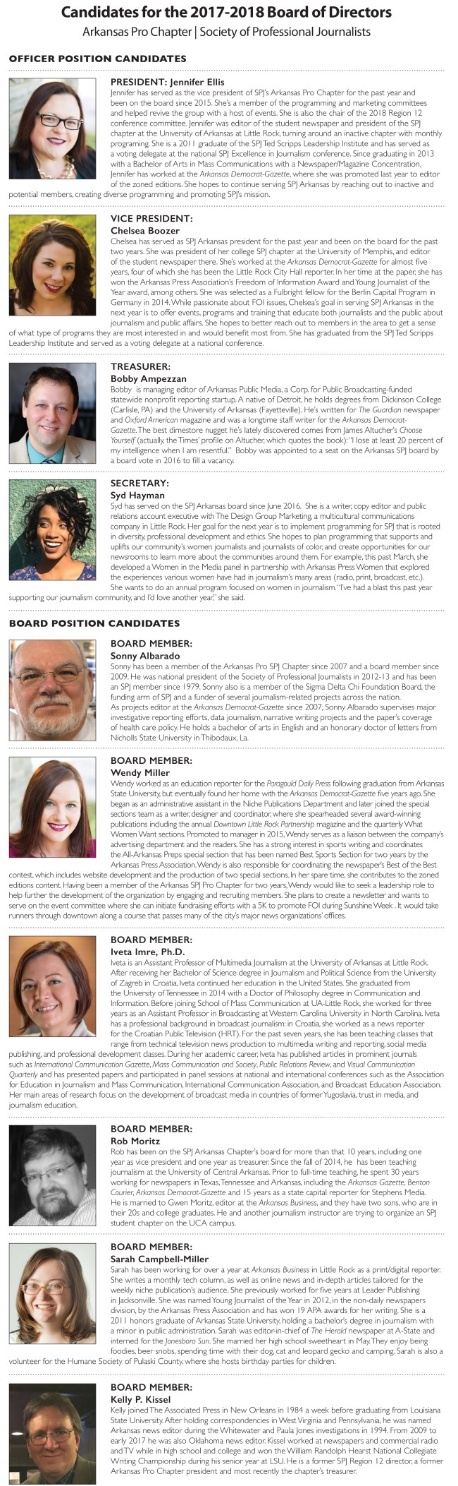 The Arkansas SPJ Board of Directors has 11 seats that are up for election each year. Included in that number are the officers: President, Vice President, Treasurer and Secretary.